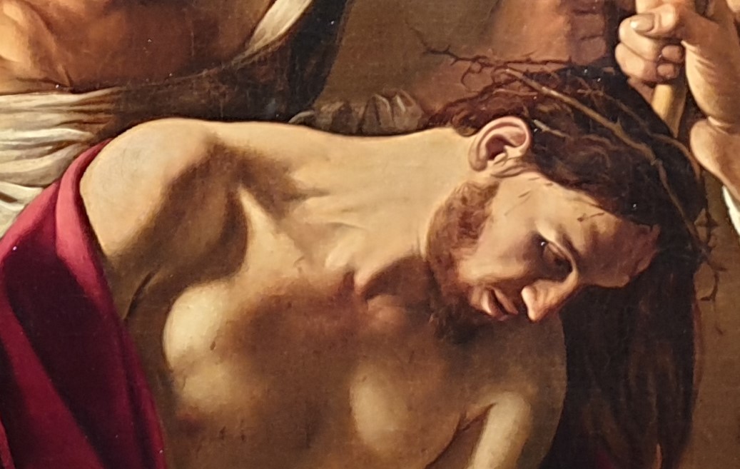 De doornenkroon werd vaak afgebeeld. Maar Caravaggio brengt ons midden in de scène en laat ons niet wegkijken. Dit drama en deze emotie waren helemaal nieuw. Bij het zien van de doornenkroon zijn we heel dicht bij de actie. Dramaturgisch versterkt Caravaggio dit gevoel door de toeschouwer die ons de rug toekeert. Schilderachtig perfect, verbeeldt hij de reflecties van licht op zijn metalen harnas. En het harnas is ook een spannend detail: want in de tijd dat de christelijke scène zich afspeelt, was er geen dergelijk harnas. Caravaggio toont ons een kijker die uit zijn eigen tijd komt: een tijdgenoot. Typerend voor Caravaggio en de Caravaggisten is de bijzondere verlichting. In het midden van de foto is de kwetsbare nek van Christus fel verlicht. Christus is overgeleverd aan blikken en slagen en lijkt bijzonder kwetsbaar in zijn naaktheid, vooral in vergelijking met de beschermende wapenrusting van de waarnemer.