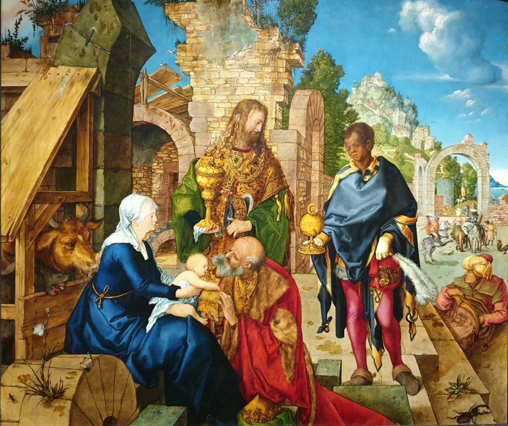 Het kleine ventje neemt het kistje met goud aan van Caspar, de oudste der wijzen. Achter hem staan Melchior en Balthasar tegen een achtergrond van een ruïne. De in profiel afgebeelde koning is in de stijl van Leonardo Da Vinci en zou kunnen gebaseerd zijn op Dürer zelf, een man met lange, blonde krullen. Hij was er ijdel genoeg voor. De drie wijzen zijn door Dürer zeer rijk aangekleed, en ook hun geschenken mogen er wezen; stoffen, brokaten, kronen en bekers (gemaakt door goudsmeden in Nürnberg), robijnen en parels. Ook de sluier van de Maagd, de dieren en planten, allemaal details naar Vlaamse smaak. Zijn vader, die als ambachtsman opleiding genoot in de Nederlanden, bracht hem de cultus bij van de grote meesters zoals Van Eyck en Van der Weyden.