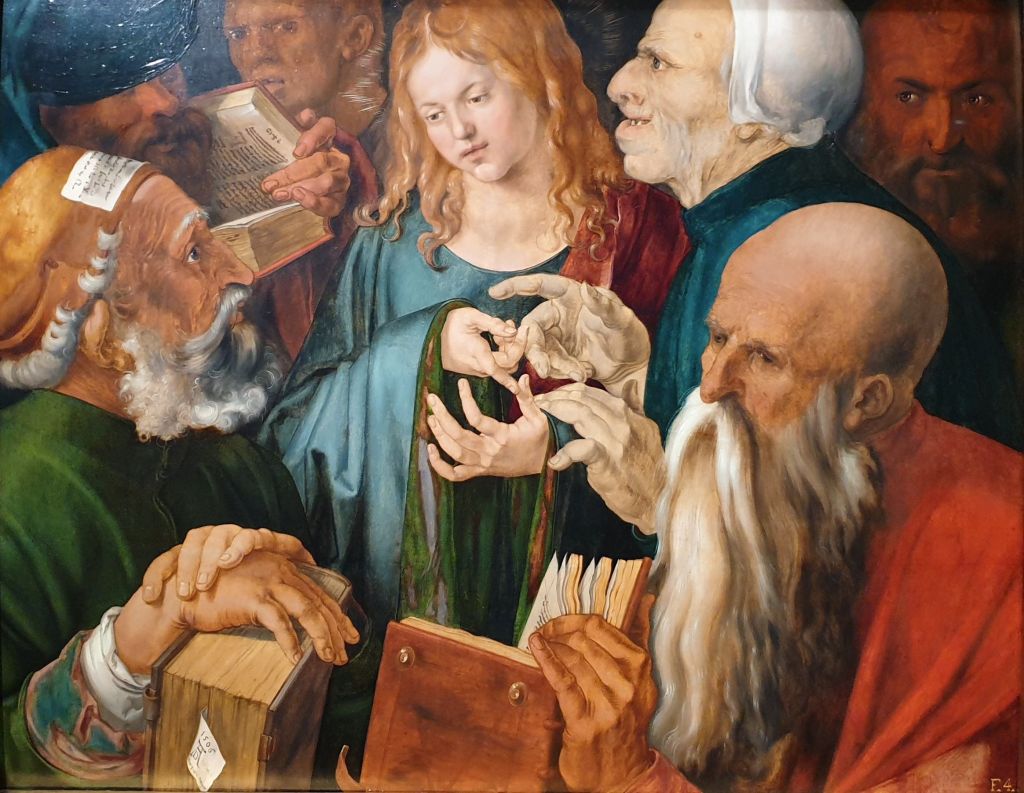 Dürer toont een rustige Jezus tussen de opgewonden koppen van de schriftgeleerden, waarvan bij sommigen hun lelijkheid hun slechtheid moet onderstrepen. Het bladwijzertje in het boek links onderaan draagt het logo van Dürer en de tekst Opus Quinque Dierum, ofwel “gemaakt in 5 dagen”. In het midden van de compositie komen allerlei gebarende handen samen. Door de figuren op niet meer dan halve lengte tonen, gaat alle aandacht naar de gezichten en de handen. In dit paneel ontmoet de noordelijke renaissance de zuidelijke, want Dürer maakte het tijdens zijn tweede bezoek aan Italië (1505-1507), in Venetië.