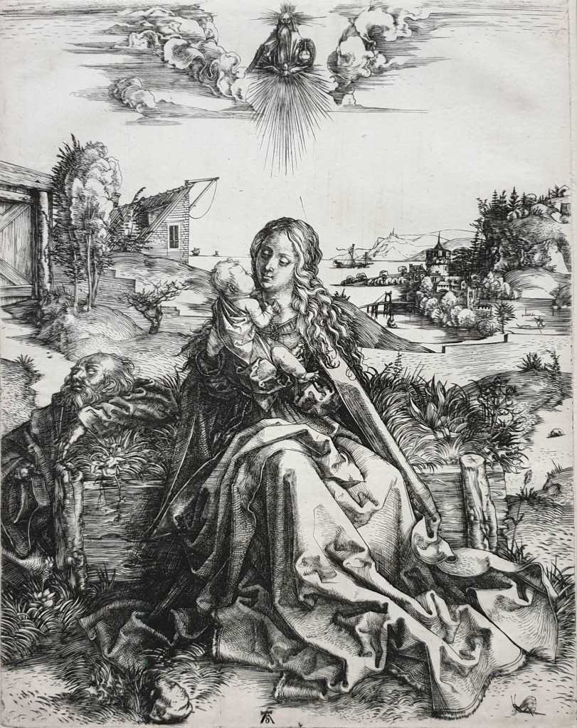 Het is een stralend zonnige dag, hoewel wij meestal de geboorte van Jezus met de nacht associëren. De kleuren op de voorgrond zijn dieprood, groen en blauw; op de achtergrond het heldere blauw van lucht en zee. Dürer werd door Italiaanse kunstenaars vooral geaccepteerd als graficus, minder als schilder, wegens niet klassiek genoeg. Durer vermelde later in een brief aan dat hij degenen die hem geen goede schilder vonden, het zwijgen had opgelegd: “jch hab awch dy moler all gschilt, dy do sagten, jm stechen wer ich gut, aber jm molen west ich nit mit farben vm zw gen” (Ik heb ook alle schilders de mond gesnoerd die zeiden, ik was goed in graveren, maar ik wist niet hoe ik met verf moest werken).