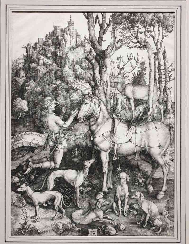 Dürer slaagt erin in deze kopergravure de verschillende texturen van vegetatie, bodem en gebouwen op overtuigende wijze over te brengen. “St. Eustachius” werd gemaakt rond 1501 en toont de bekering van de nobele Romeinse soldaat Placidus, terwijl hij tijdens de jacht de gekruisigde Christus tussen het gewei van een hert ziet. De soldaat, die de doopnaam Eustachius kreeg, knielt op de oever van een beek, naast zijn paard, en kijkt met uitgestrekte armen naar de verschijning op de achtergrond.