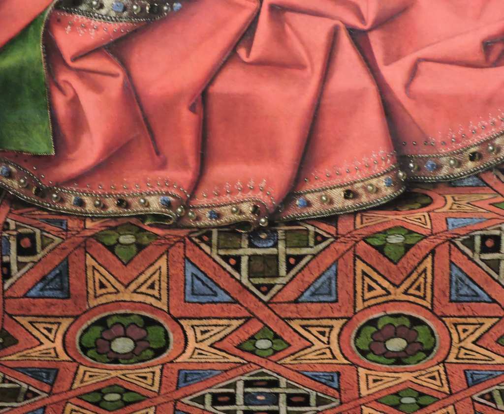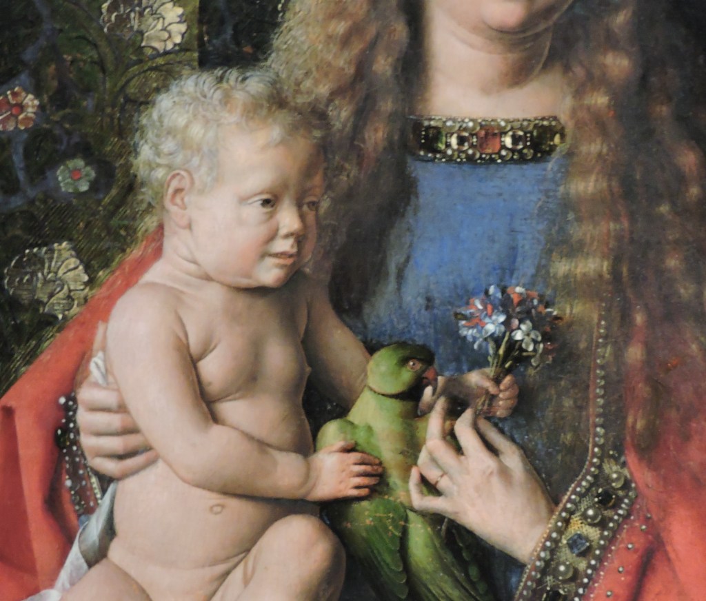 Het schilderij uit 1436 oogt als een etalage met luxegoederen die in de 15e eeuw te koop waren in Brugge: tegels uit Spanje, een dik tapijt uit het Midden-Oosten, goudbrokaat, parels, edelstenen. En exotische dieren: het kindje Jezus houdt een halsbandparkiet vast, van het soort dat bij ons luid krijsend in de parken zit. Het schilderij blinkt en glinstert. In het schild van Sint-Joris zie je zelfs het spiegelbeeld van Jan van Eyck.