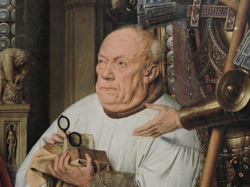 Van Eyck beeldt Van der Paele af naast Maria en Jezus, Sint-Donatius en Sint-Joris. Op het eerste gezicht is de man maar eenvoudig gekleed, vergeleken met de rijkelijk versierde gewaden en harnassen. Maar het zit ‘m in de sjieke details: een eekhoornpelsje, een duur boek, een bril.