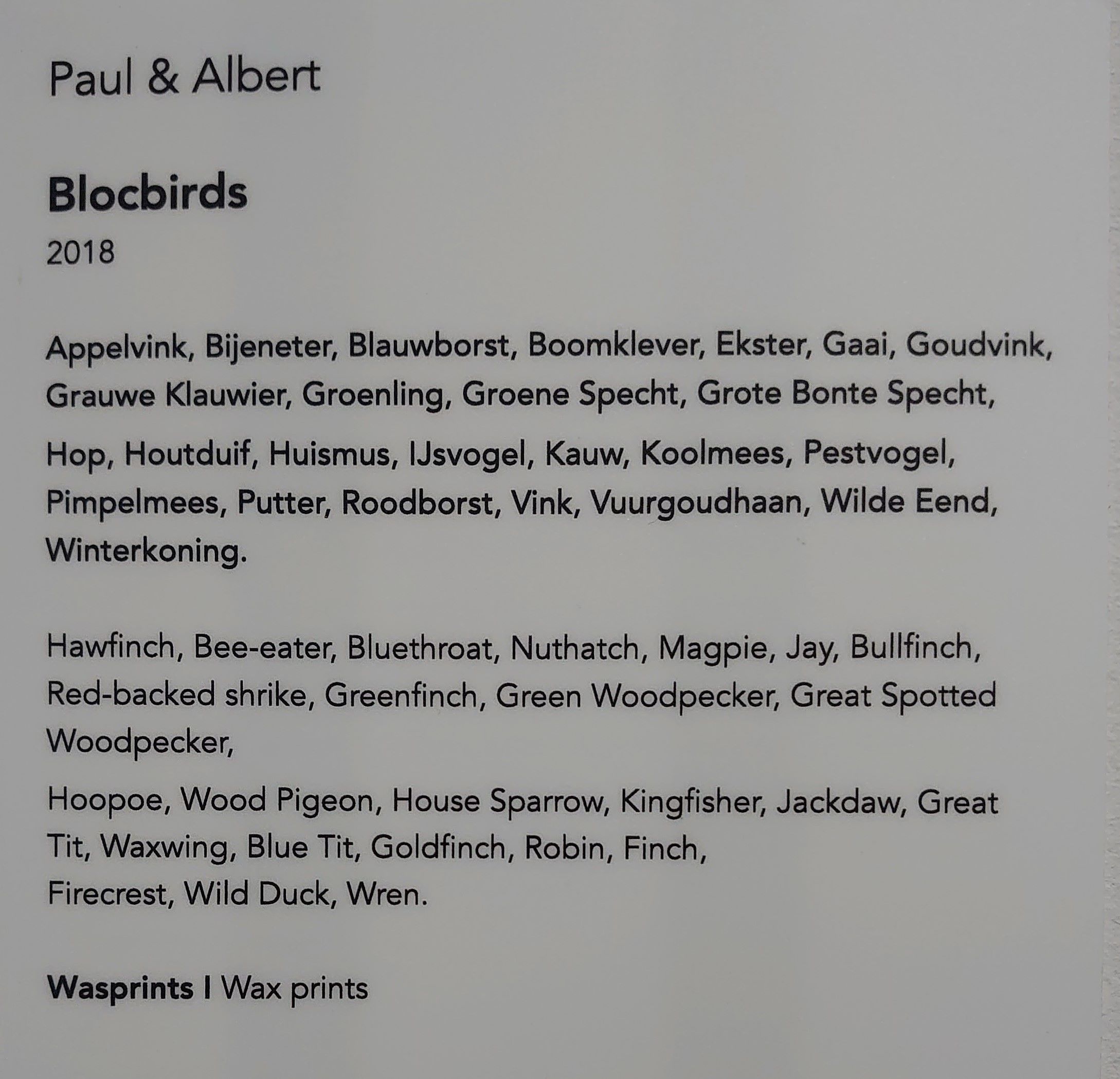 Paul & Albert (www.paul-albert.com)is een duo dat zich beweegt op het snijvlak van kunst en design. Blocbirds is een prijswinnende serie waarbij 25 vogels zijn teruggebracht tot abstracte grafische composities. Het fascinerende is dat in deze grafische verschijningsvorm de vogels nog steeds te herkennen zijn