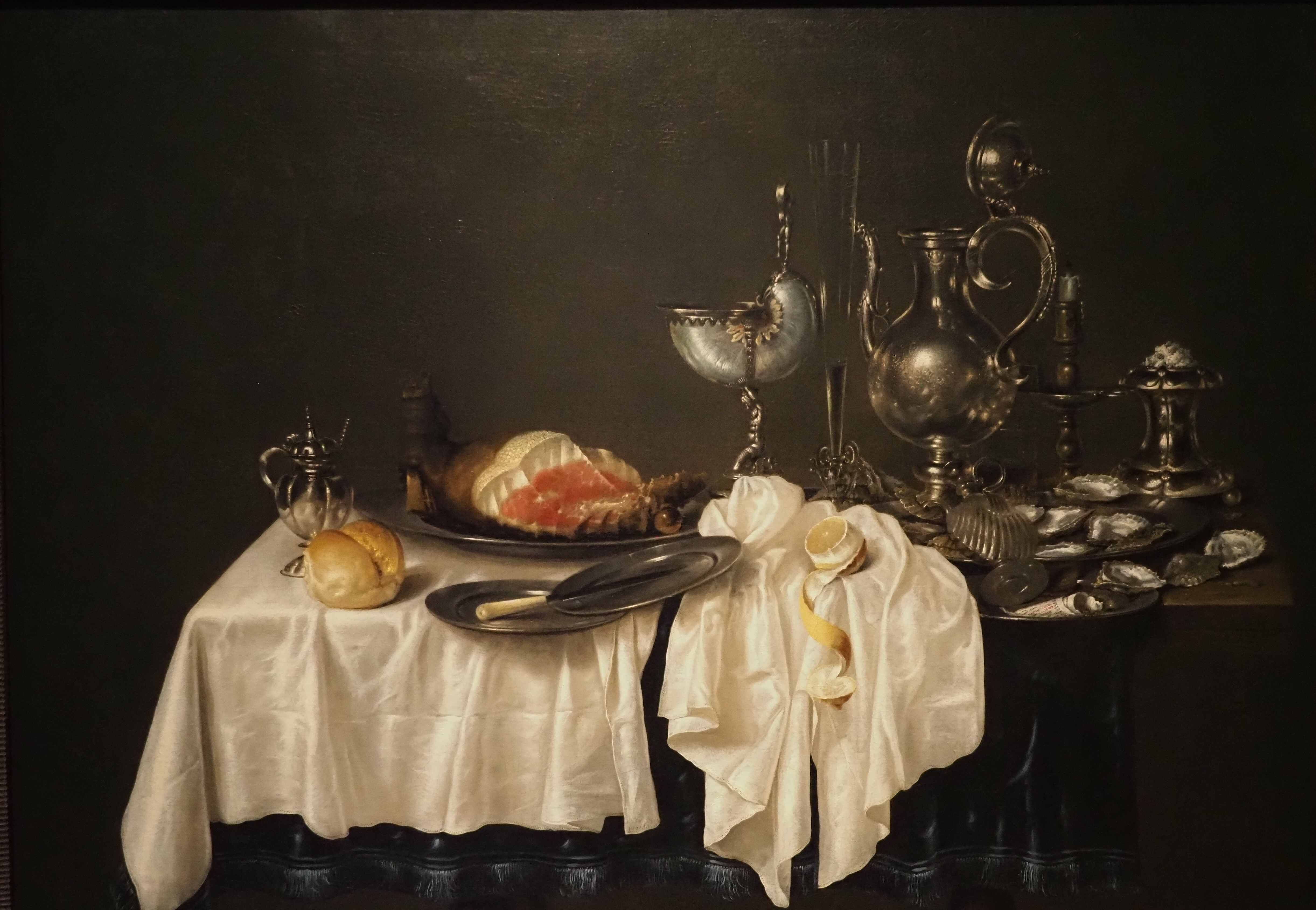 Willem Claesz. Heda, Stilleven met ham en nautilusschelp, 1654Willem Kalf, Stilleven met glazen en zilveren schaal, 1656El Greco, Christ on the Mount of Olives, ca. 1610Jan Breughel de Oude en Hendrick Van Balen, Allegory of Public Welfare, begin 17de eeuwJan Lievens, Young Girl, ca. 1630Anthonis Van Dyck, Portrait of a Man, ca. 1617-1620Velasquez, Saint Jerome, ca. 1620Sebastiaan Vranckx, Elegant Company dining Outdoors, ca. 1610-1620
